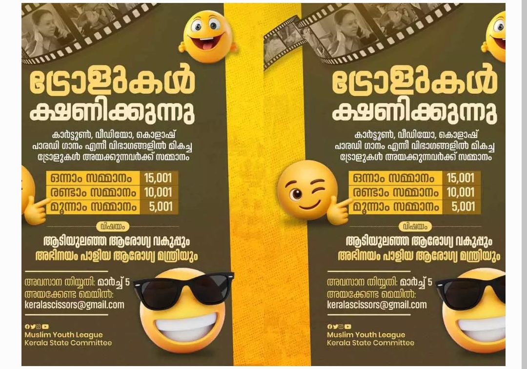 കോഴിക്കോട്: ആരോഗ്യവകുപ്പിന്റെ പ്രവർത്തനങ്ങളെ പരിഹസിച്ച് ട്രോൾ മത്സരവുമായി യൂത്ത് ലീഗ് സംസ്ഥാന കമ്മിറ്റി. ‘ആടിയുലഞ്ഞ ആരോഗ്യവകുപ്പും അഭിനയം പാളിയ ആരോഗ്യമന്ത്രിയും’ എന്ന വിഷയത്തിലാണ് ട്രോളുകൾ അയക്കേണ്ടത്.കാർട്ടൂൺ, വീഡിയോ, കൊളാഷ്, പാരഡി ഗാനം എന്നീ വിഭാഗങ്ങളിൽ ട്രോളുകൾ അയക്കാം. 15,001 രൂപയാണ് ഒന്നാം സമ്മാനം. 10,001 രണ്ടാം സമ്മാനവും 5,001 രൂപ മൂന്നാം സമ്മാനവും നൽകും. ട്രോളുകൾ മാർച്ച് അഞ്ചിന് മുമ്പ് keralascissors@gmail.com എന്ന വിലാസത്തിൽ അയക്കണം.