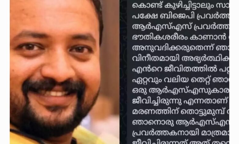 Read More »‘ തൃശൂർ: ബിജെപിക്കും ആർഎസ്എസിനും എതിരെ രൂക്ഷ വിമർശനവുമായി മരിച്ച ആർഎസ്എസ് പ്രവർത്തകൻ ആനന്ദ് കെ. തമ്പിയുടെ കുറിപ്പ്. ഭൗതികശരീരം എവിടെ കുഴിച്ചിട്ടാലും സാരമില്ല പക്ഷേ ബിജെപി,…