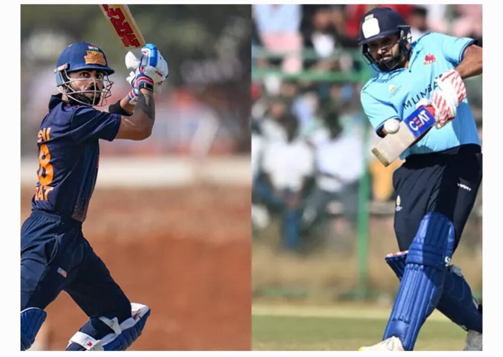 ഡൽഹി: വിജയ് ഹസാരെ ട്രോഫിയിൽ ആദ്യ മത്സരത്തിൽ സെഞ്ച്വറിയുമായി രോഹിത് ശർമയും വിരാട് കോഹ്ലിയും തിളങ്ങി. ആന്ധ്രാപ്രദേശിനെതിരെ ഡെൽഹിക്കായി 101 പന്തിൽ 131 റൺസാണ് വിരാട് കോഹ്ലി സ്കോർ ചെയ്തത്. 14 ഫോറും മൂന്ന് സിക്സുമാണ് വിരാട് അടിച്ചത്. മറ്റൊരു മത്സരത്തിൽ സിക്കിമിനെതിരെ 94 പന്തിൽ 18 ബൗണ്ടായിരിക്കും ഒമ്പത് സിക്സറും പറത്തി 155 റൺസാണ് രോഹിത് നേടിയത്.ആന്ധ്ര ഉയർത്തിയ 299 റൺസ് എന്ന ലക്ഷ്യത്തിലേക്ക് ചെസ് ചെയ്യവെയാണ് ചെസ് മാസ്റ്റർ വിരാട് കോഹ്ലിയുടെ സെഞ്ച്വറി പിറന്നത്. വിരാടിന്റെ മുന്നും പ്രകടനത്തിന്റെ കരുത്തിൽ ഡൽഹി 37.4 ഓവറിൽ നാല് വിക്കറ്റ് നഷ്ടത്തിൽ അനായാസം ലക്ഷ്യം കണ്ടു. സിക്കിമിനെതിരെ 237 റൺസ് വിജയലക്ഷ്യത്തിലേക്ക് ചെസ് ചെയ്യവെയാണ് രോഹിത് ശർമയുടെ സെഞ്ച്വറിയും പിറന്നത്. 20 ഓവർ ബാക്കി നിൽക്കെയാണ് മുംബൈ ലക്ഷ്യത്തിലെത്തിയത്. വിജയ് ഹസാരെ ട്രോഫിയിൽ ഇന്ന് നടന്നത് 19 മത്സരങ്ങളിൽ 21 താരങ്ങൾ സെഞ്ച്വറി നേടി. ഒഡിഷയുടെ സ്വസ്തിക് സമാലാണ് ഇരട്ട സെഞ്ച്വറി നേടിയത്. ബിഹാർ നിരയിൽ സ്റ്റാർ ബാറ്റർ വൈഭവ് സുര്യവൻശി, ആയുഷ് ആനന്ദ്, സാകിബുൽ ഗനി എന്നിങ്ങനെ മൂന്ന് താരങ്ങൾ സെഞ്ച്വറി സ്കോർ ചെയ്തു. ജാർഖണ്ഡിനായി ഇഷാൻ കിഷൻ, കർണാടകക്കായി ദേവദത് പടിക്കൽ, കേരളത്തിനായി വിഷ്ണു വിനോദ് എന്നിവരും സെഞ്ച്വറി പൂർത്തിയാക്കി.