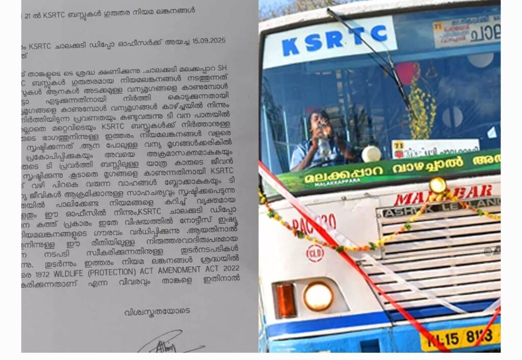 തിരുവനന്തപുരം: കെഎസ്ആർടിസിക്ക് വനം വകുപ്പിൻ്റെ മുന്നറിയിപ്പ്. വന്യജീവികളുടെ ഫോട്ടോ എടുക്കാൻ ബസ് നിർത്തരുതെന്നാണ് മുന്നറിയിപ്പ്. ഇനിയും ആവർത്തിച്ചാൽ വന്യജീവി സംരക്ഷണ നിയമപ്രകാരം കേസെടുക്കുമെന്നും ചാലക്കുടി എടിഒക്ക് ഷോളയാർ റേഞ്ച് ഓഫീസർക്ക് നൽകിയ കത്തിൽ. മലക്കപ്പാറ റൂട്ടിൽ ആനയുൾപ്പെടെ റോഡിൽ ഇറങ്ങുമ്പോൾ ബസ് അടുത്ത് കൊണ്ട് നിർത്തരുത്. ജീവനക്കാരെ ഇതിൽ നിന്ന് കെഎസ്ആർടിസി പിന്തിരിപ്പിക്കണമെന്നും റേഞ്ച് ഓഫീസർ. കെഎസ്ആർടിസി ബസുകൾ ഗുരുതരമായ നിയമ ലംഘനം നടത്തുന്നത് ശ്രദ്ധയിൽപെട്ടിട്ടുണ്ടെന്നും വന്യമൃഗങ്ങളെ കാണുമ്പോൾ കാഴ്ച്ചയിൽ നിന്നും മറയുന്നത് വരെ റോഡിൽ ബസ് നിർത്തിയിടുന്ന പ്രവണത കണ്ടുവരുന്നെന്നും ഉത്തരവിൽ പറയുന്നു. വന്യ മൃഗങ്ങൾക്കരികിൽ ബസ് നിർത്തുന്നത് മൃഗങ്ങളെ പ്രകോപിപ്പിക്കുകയും അവയെ അക്രമാസക്തമാകുകയും ചെയ്യും. ഇത് ബസിലുള്ള യാത്രകാരുടെ ജീവൻ അപകടത്തിലാക്കുന്ന സാഹചര്യം സൃഷ്ടിക്കുന്നുവെന്നും ഗതാകത തടസ്സം ശൃഷ്ടിക്കുമെന്നും വനം വകുപ്പിൻ്റെ മുന്നറിയിപ്പ് നൽകുന്നു. മലക്കപ്പാറയിൽ കാട്ടാനയെ യാത്രക്കാർ പ്രകോപിപ്പിക്കുന്നതിനെ തുടർന്ന് വലിയ പ്രശ്നങ്ങളാണ് കഴിഞ്ഞ ദിവസങ്ങളിലുണ്ടായത്. അന്തർസംസ്ഥാന പാതയിൽ നിലയുറപ്പിച്ച ‘കബാലി’ എന്ന കാട്ടാനയെ വാഹനം ഇടിപ്പിച്ച് പ്രകോപിപ്പിക്കാനാണ് ശ്രമം നടന്നത്. ഹോൺ മുഴക്കുകയും ആനയുടെ അടുത്തേക്ക് വണ്ടി ഓടിച്ച് പ്രകോപനം സൃഷ്ടിക്കാൻ ശ്രമിക്കുകയും ചെയ്യുകയായിരുന്നു.