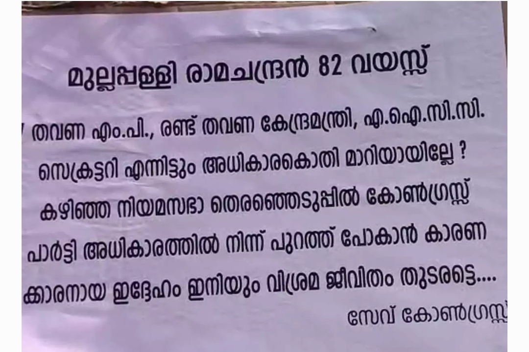 82കാരനായ മുല്ലപ്പള്ളി ഇനി വിശ്രമജീവിതം നയിക്കട്ടെ’; തെരഞ്ഞെടുപ്പില് വീണ്ടും മത്സരിക്കാനുള്ള നീക്കത്തില് മുല്ലപ്പള്ളിക്കെതിരെ അഴിയൂരില് പോസ്റ്റര്